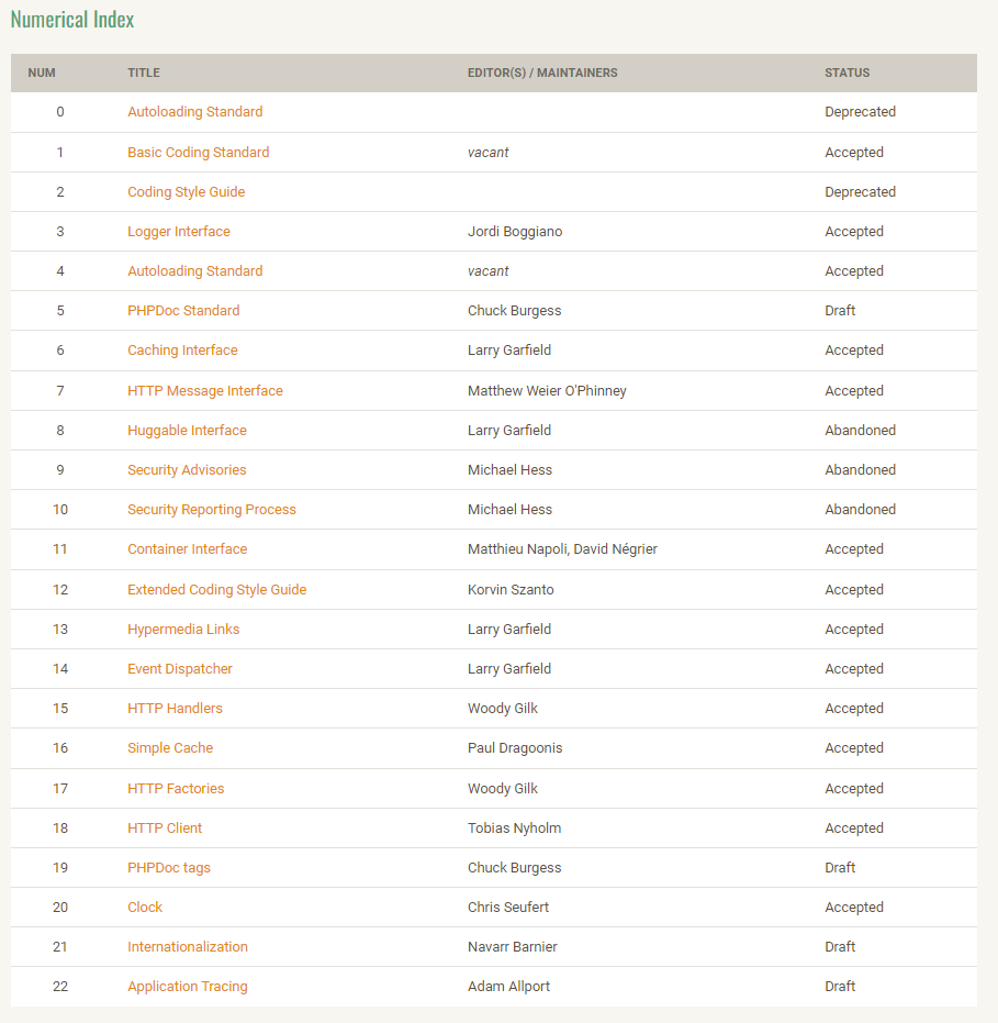 'PSR-숫자' 형식을 갖고 있는데, 해당 숫자마다 주로 다루는 타이틀이 존재하며, 일반적인 코딩 표준, 로깅, 이벤트 등 많은 권고가 존재하나, 역시 문서를 하나 하나 다 외울 수는 없듯이 PSR 또한 가장 중요한 내용만이라도 익혀야 한다.