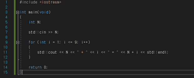 N을 입력받은 뒤, 구구단 N단을 출력하는 프로그램을 작성하시오. 출력 형식에 맞춰서 출력하면 된다.