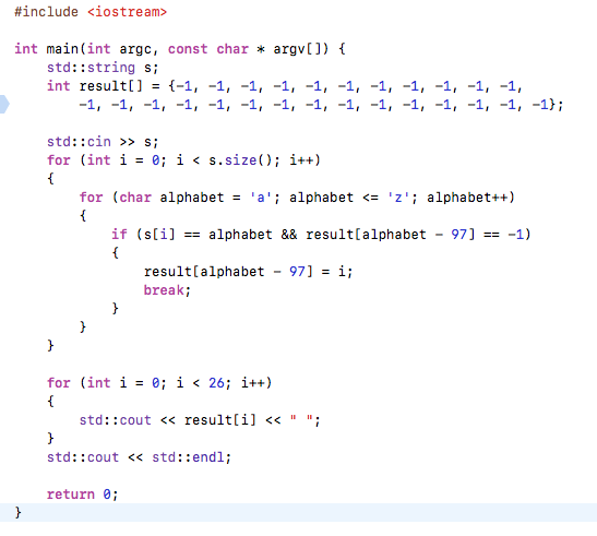 알파벳 소문자로만 이루어진 단어 S가 주어진다. 각각의 알파벳에 대해서, 단어에 포함되어 있는 경우에는 처음 등장하는 위치를, 포함되어 있지 않은 경우에는 -1을 출력하는 프로그램을 작성하시오.