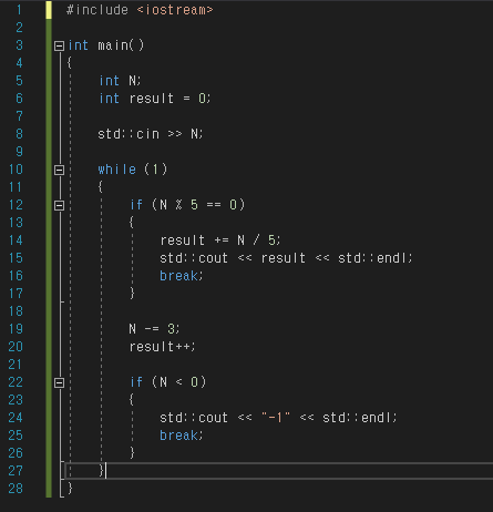 상근이가 설탕을 정확하게 N킬로그램 배달해야 할 때, 봉지 몇 개를 가져가면 되는지 그 수를 구하는 프로그램을 작성하시오.