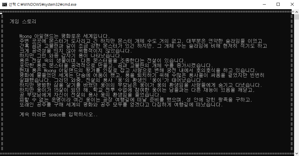 갑자기 나타난 드래곤에게 마을을 빼앗겨 다시 마을을 탈환하고 공주를 구출하기 위해 여행을 떠나는 용사(웅이)의 모험을 C++ 콘솔로 나타낸 게임
