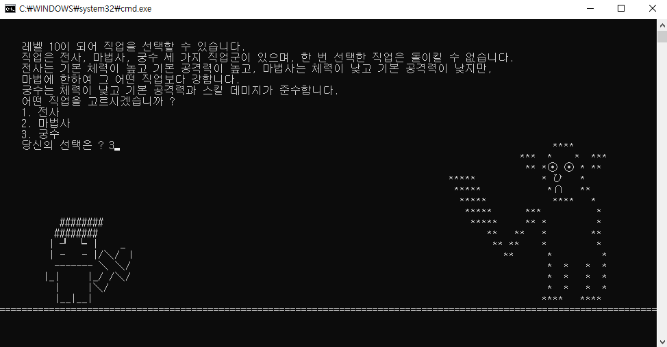 콘솔상 이미지를 나타내기 위한 파트로써, gotoXY(int x, int y) 라는 함수를 통해 콘솔에서의 위치를 조정하여 그림을 그릴 수 있도록 하고 용사, 몬스터 등 각각의 x, y좌표를 받고 해당하는 콘솔의 위치에 나타날 수 있도록 표현.