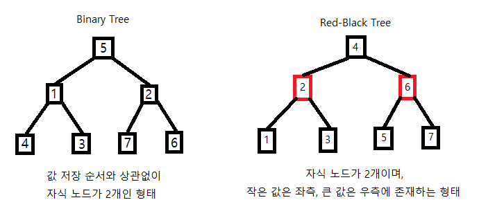 이진트리와 레드-블랙 트리를 비교하자면 다음과 같습니다.