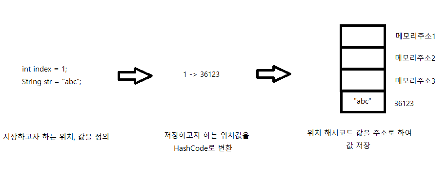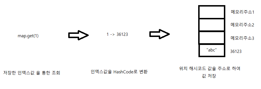 Map : 값과 인덱스 구분 (인덱스를 해시 코드로 변환해 해당 위치에 값 저장)