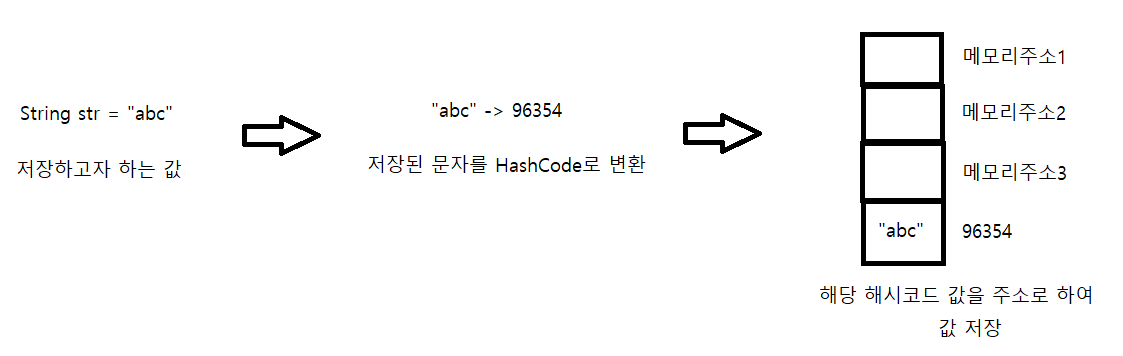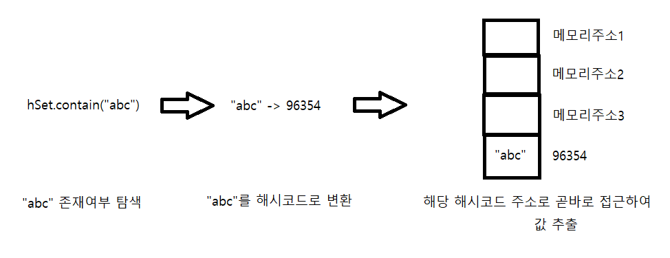 Set : 값이 곧 인덱스 (값을 해시 코드로 변환해 해당 위치에 저장)