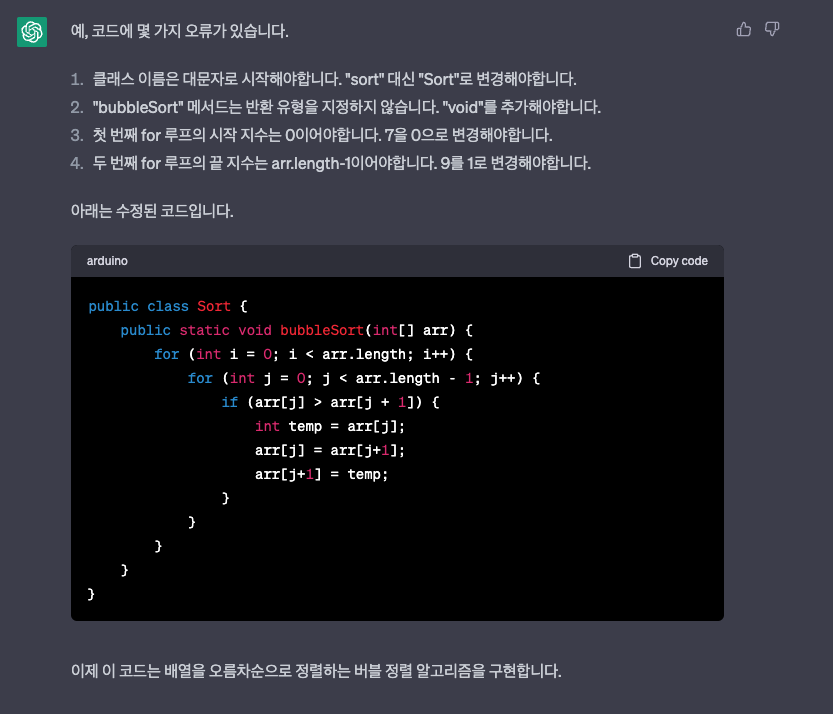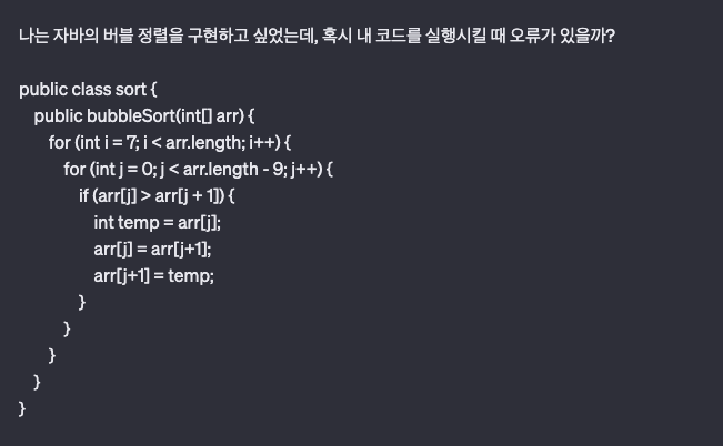 j 변수는 전체 길이에서 -1만 해야 하는데 -9를 해줍시다. 그다음에 chatGPT한테 오류를 잡아달라 해보죠.