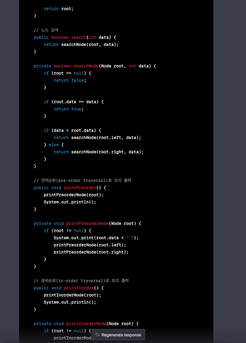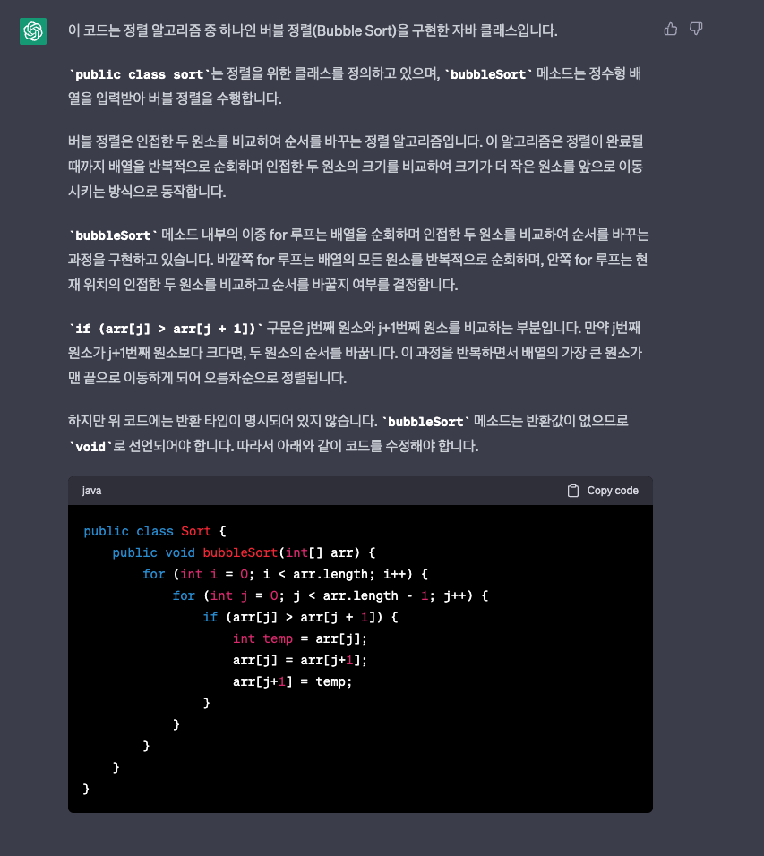마지막에 설명하는 부분에 있어 chatGPT상에서 글자가 좀 잘린 것 같기는 한데, 코드를 짜주길 바랬던 거지 설명은 필요 없으니 넘어가고, 코드 부분에는 주석까지 아주 멋있게 달아줬습니다.