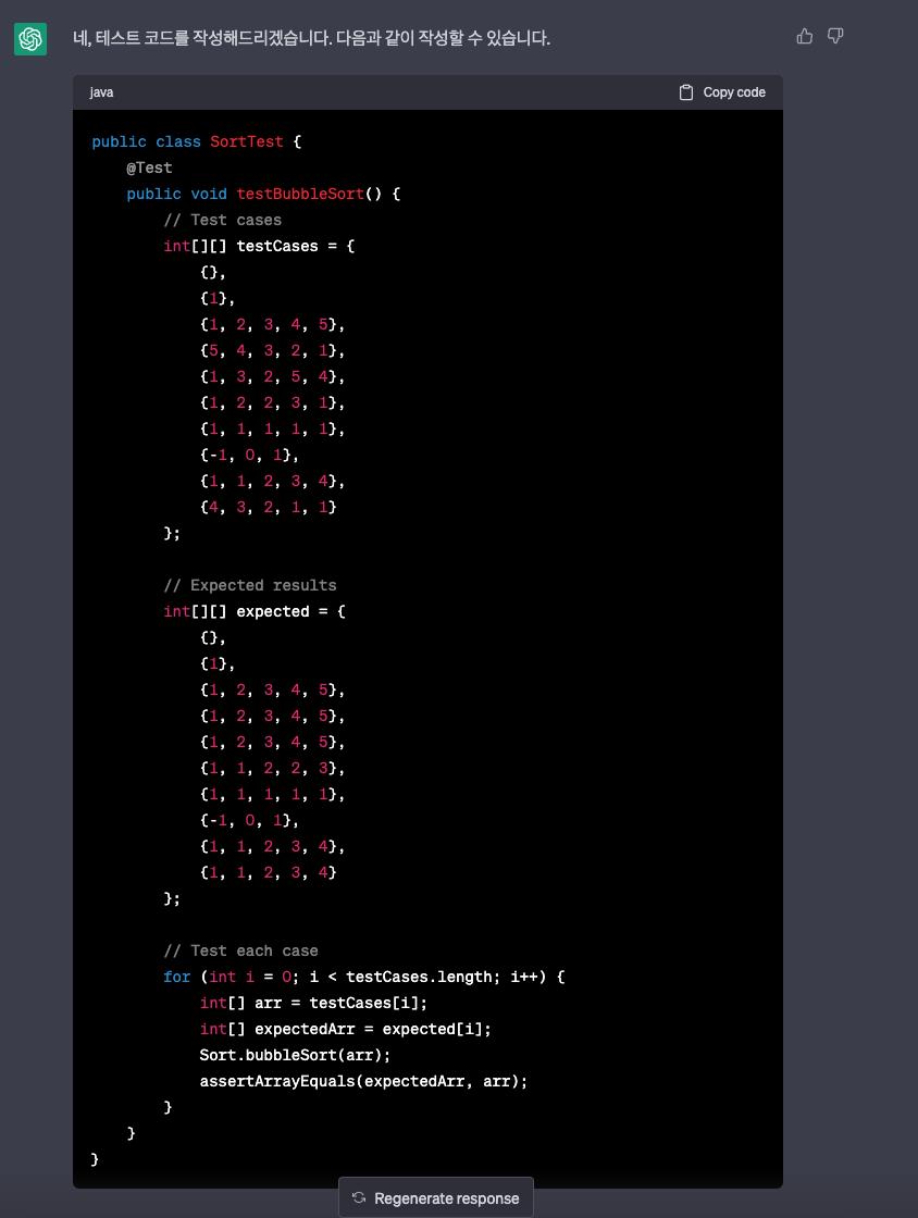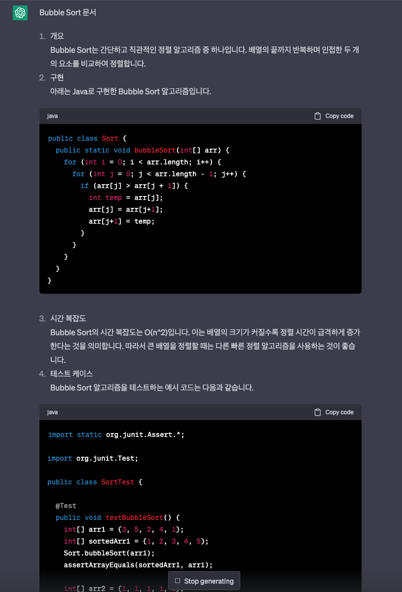 다만, 활용할 여지는 충분히 많다고 생각하며, 단순히 chatGPT가 만들어 주는 내용으로 끝내는 것이 아니라, 스스로 본인의 환경에 맞게 수정하는 작업까지 진행을 한다면 직접 작성하기 귀찮은 코드들을 작성하는 시간을 줄여주고 안정적인 코드를 얻을 수 있을 것 같다는 생각을 했습니다.